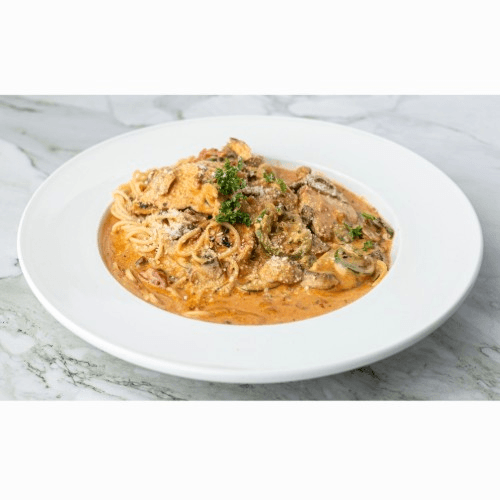 Sauteed with artichoke hearts and mushrooms with pink sauce.