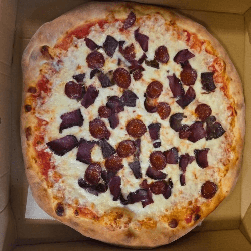 Albanian smoked beef sausage (halal), Beef smoked prosciutto (halal), red sauce & mozzarella cheese