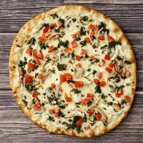 Spinach, mushrooms, onions, sliced tomatoes, ricotta and extra cheese (no sauce).