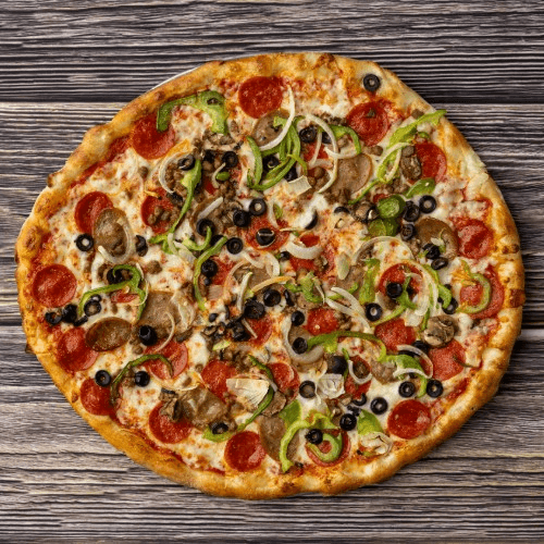 Pepperoni, sausage, hamburger, mushrooms, bell peppers, onions and black olives.